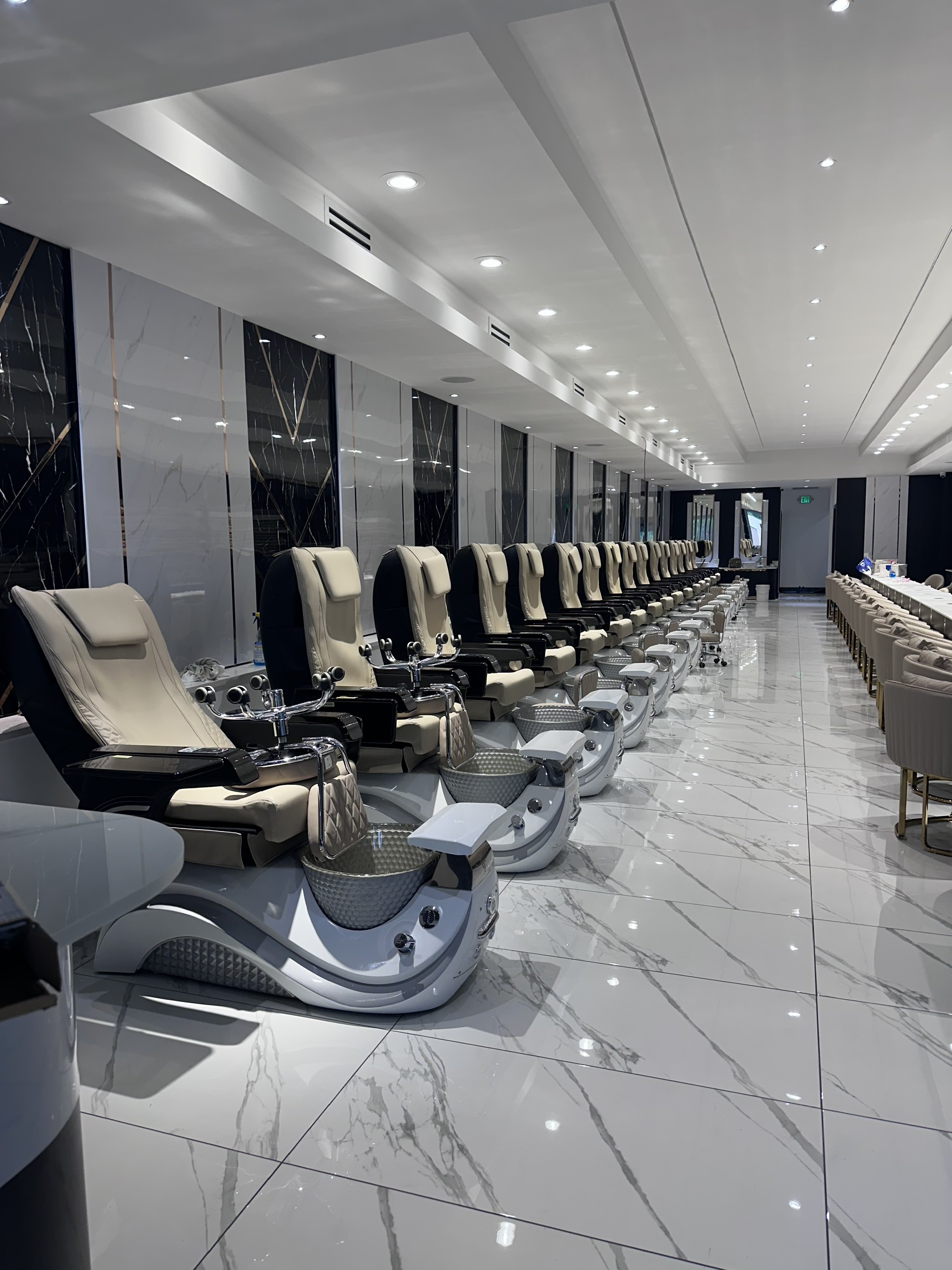 A clean, bright pedicure area equipped with premium spa chairs. Comfort seating, soft-glow LED basins, and curated product displays deliver a professional experience.