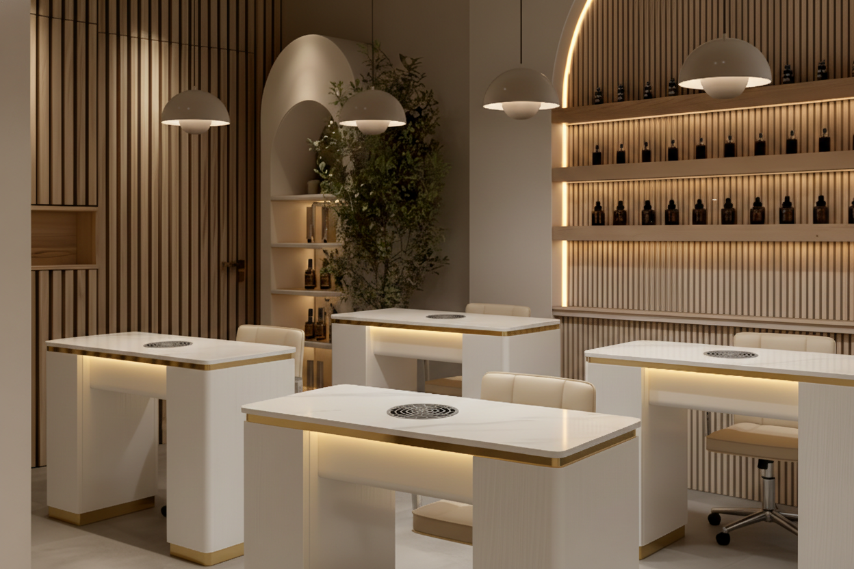 The Aurora Single Exhaust Fan & Dust Collector is designed to support salons that prioritize cleanliness and client comfort without sacrificing space. Its compact form integrates easily into single manicure stations, making it ideal for smaller studios, private rooms, or space-efficient salon layouts.