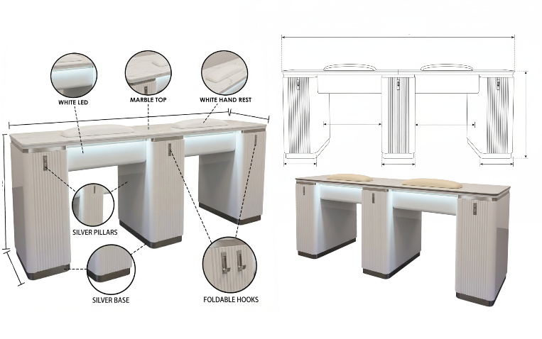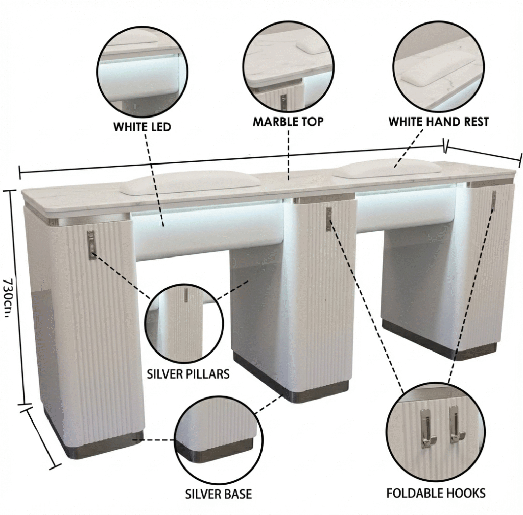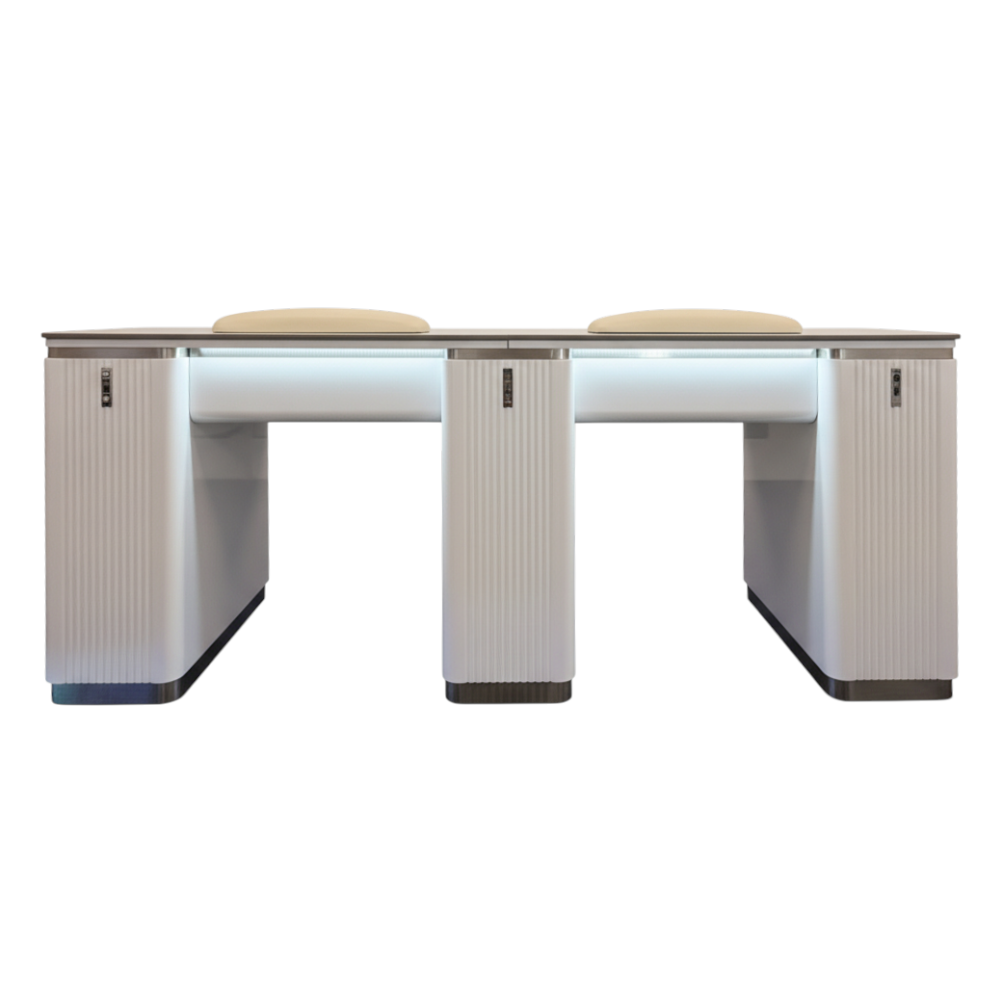 Double White Silver Manicure Tablesare built to support side-by-side manicure services in a clean, organized format. Whether serving pairs or managing higher client flow, these configurations help salons scale capacity while maintaining visual order.