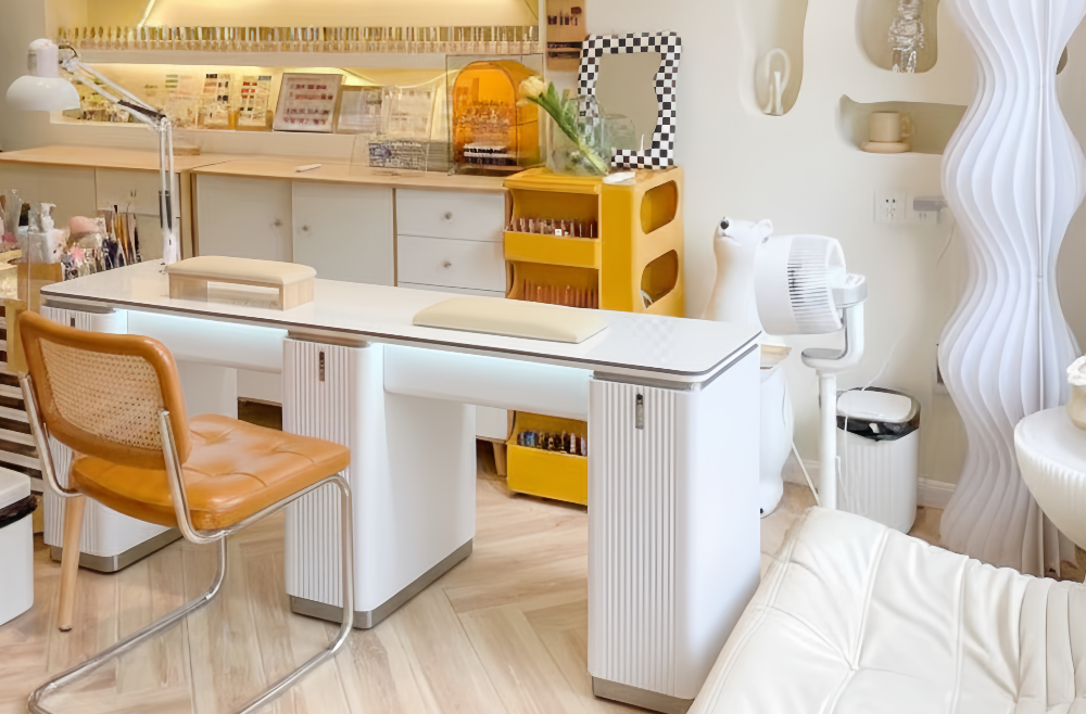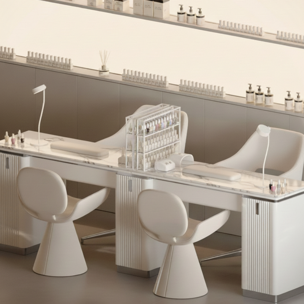 Each seat is proportioned for technician comfort and client ease, creating a consistent rhythm across the manicure area. The unified structure reduces clutter and keeps the floor plan visually balanced.