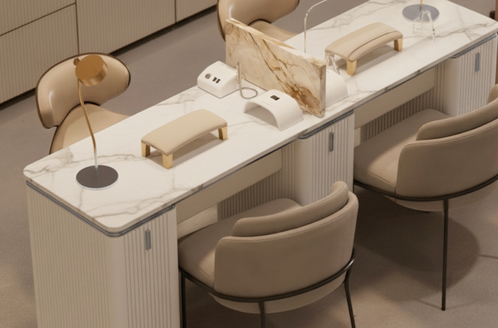 Multi-seat manicure tables designed for efficient service and cohesive salon layouts.