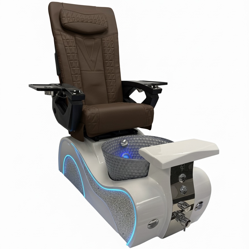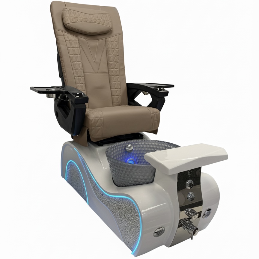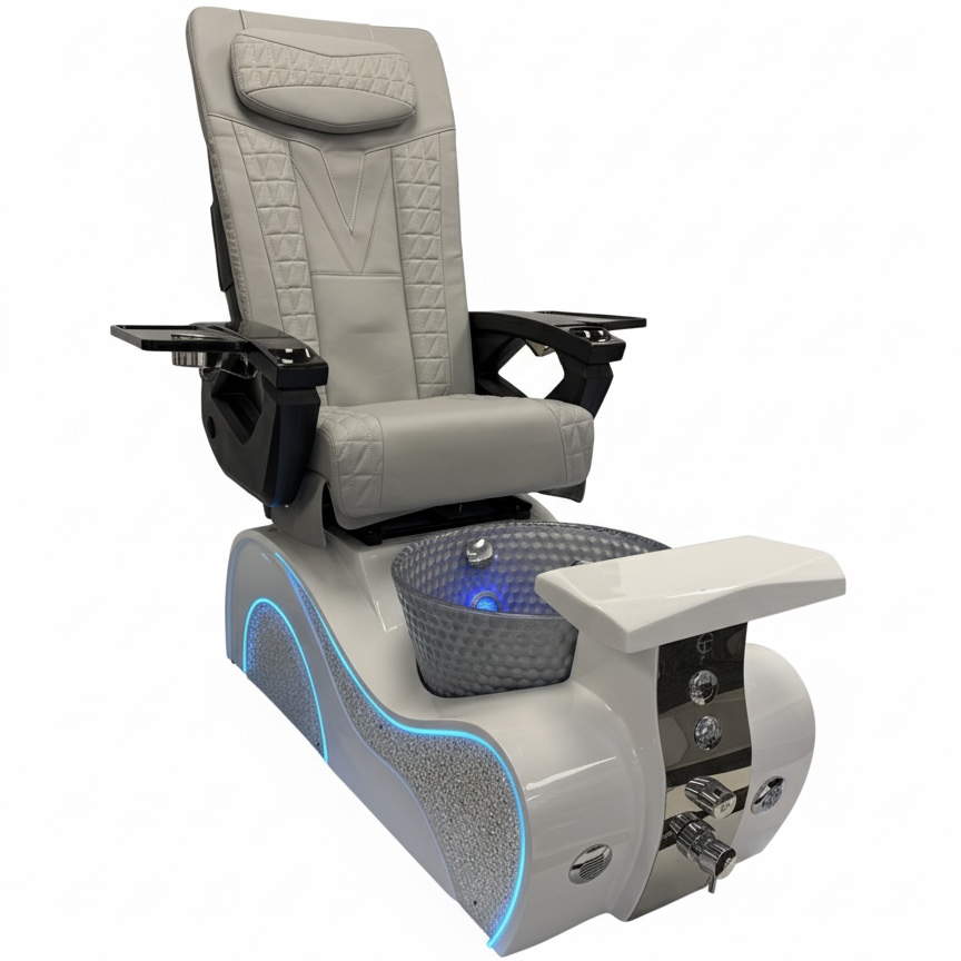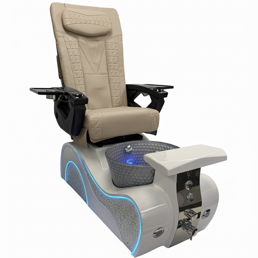 The White Base Edition preserves the full functionality of the New Wave line: acetone-resistant PU leather, smooth reclining motion, heated back massage, and ergonomic shaping that enhances comfort through the entire pedicure service. For technicians, integrated controls at the armrest, USB charging, a device holder, and practical storage elements streamline daily workflow.
