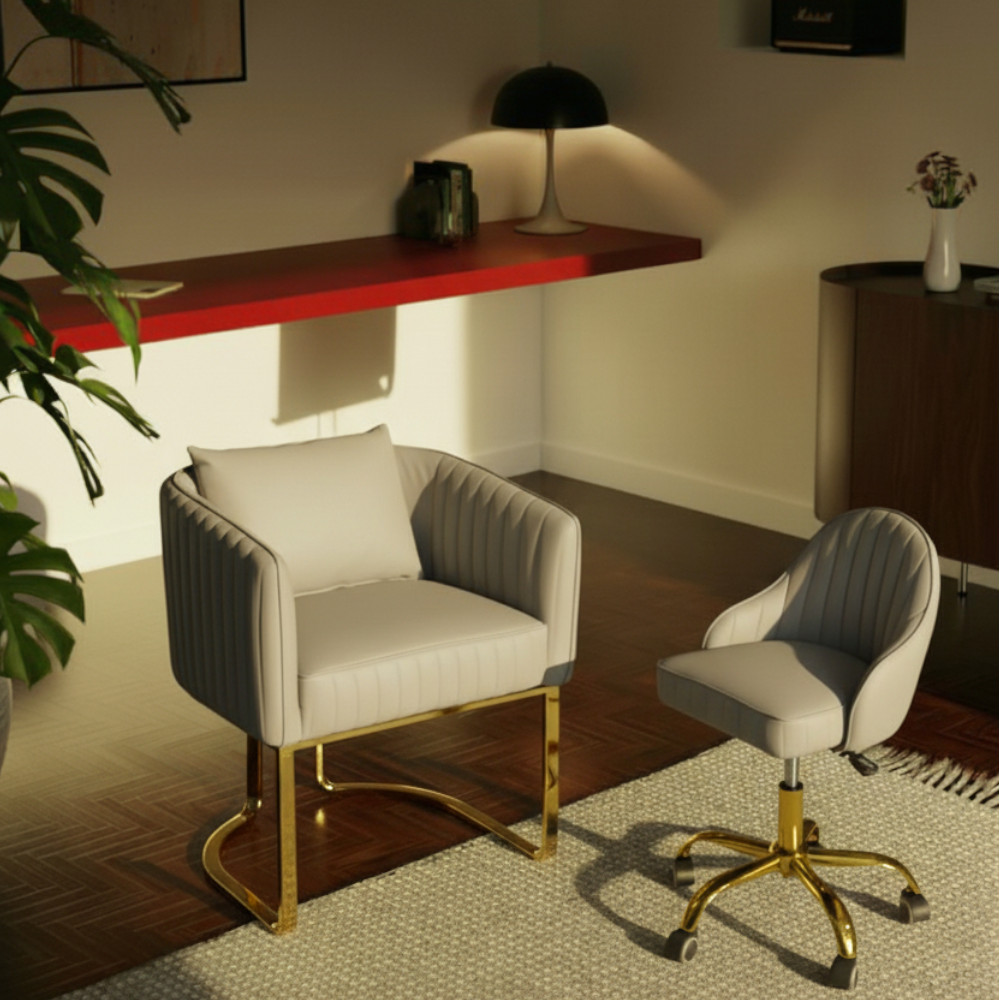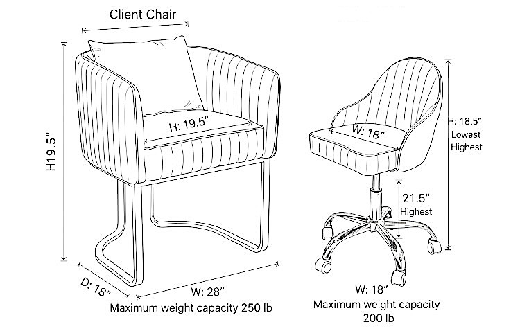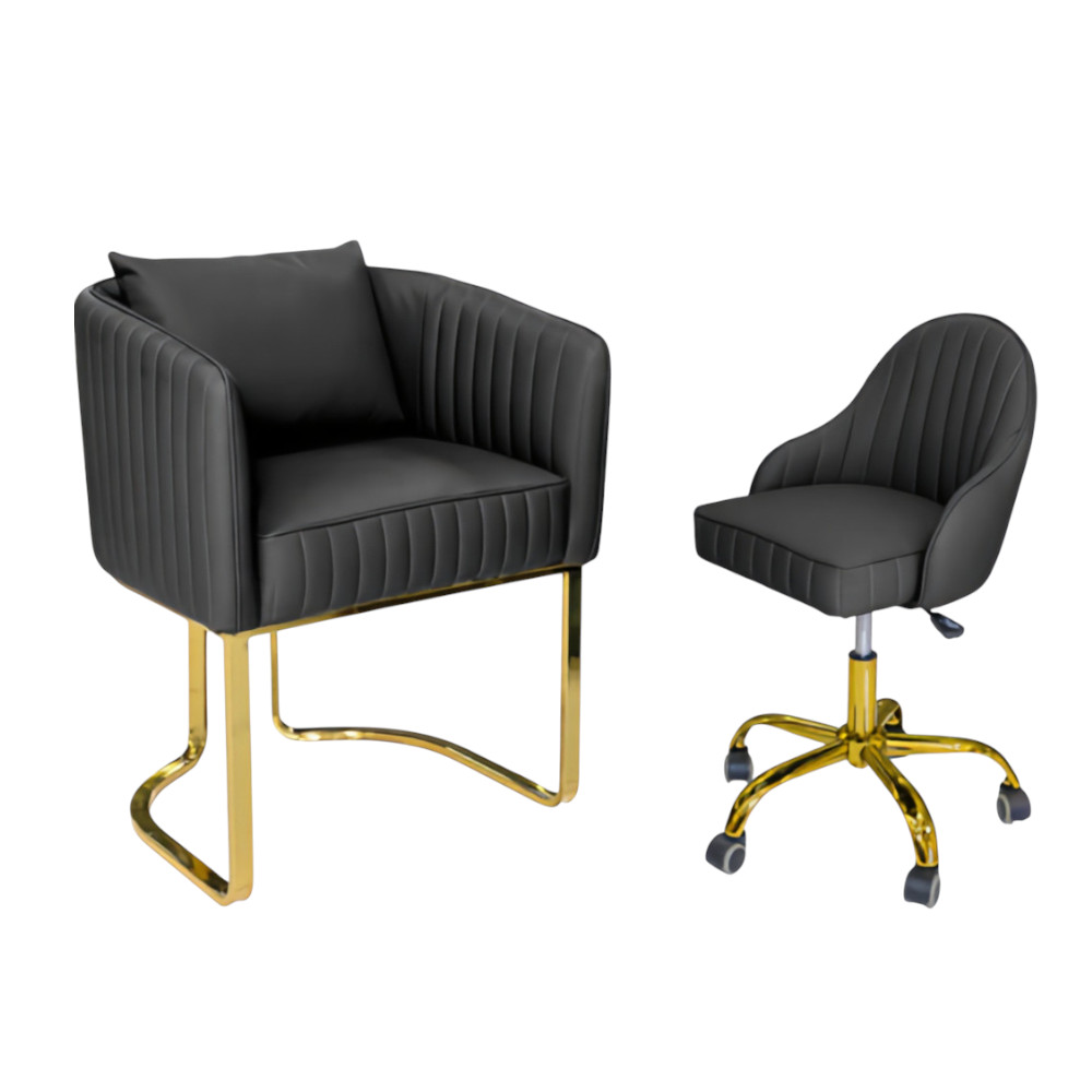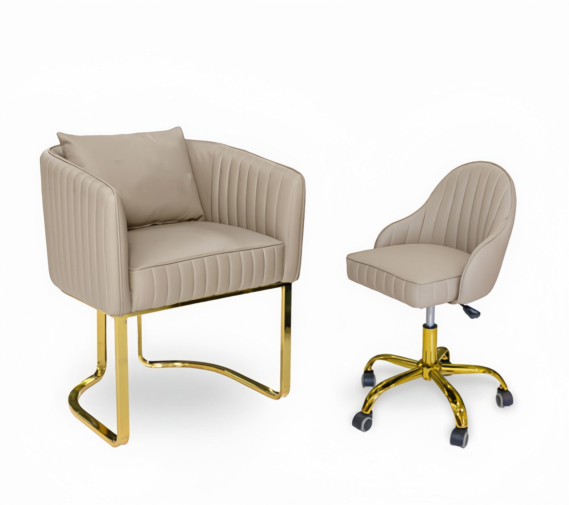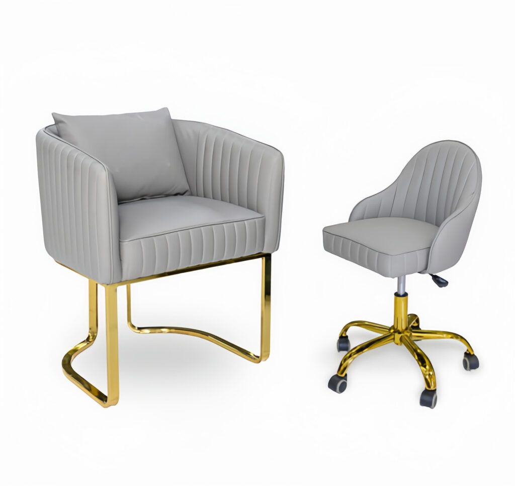 The salon furniture set includes a Customer Chair, a Technician Chair, and a back pillow. Available in Gray, Black, or Khaki with Gold or Chrome legs. Spacious, durable, and acetone-resistant leather combo suitable for various salon setups