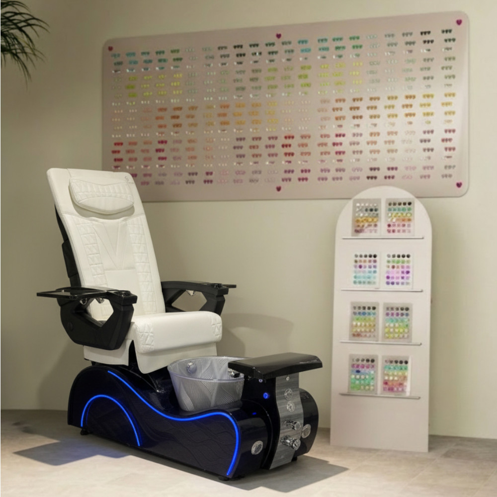 The New Wave Black Base Pedicure Chair with Grey Bowl delivers a clean, modern aesthetic through a carefully balanced monochrome palette. The deep black spa base anchors the design with strength and sophistication, while the smooth grey bowl introduces a softer tone—creating a minimal, harmonious look perfect for contemporary nail salons and wellness-inspired interiors.
