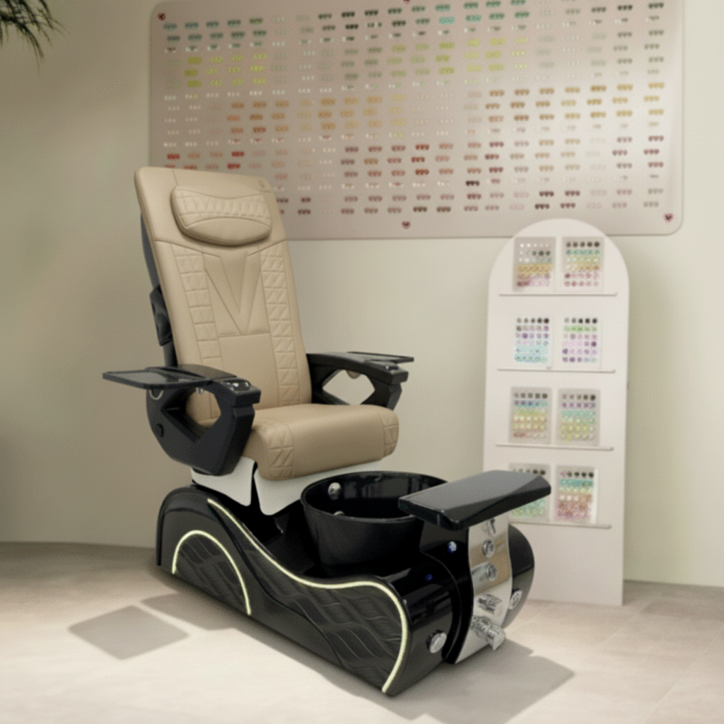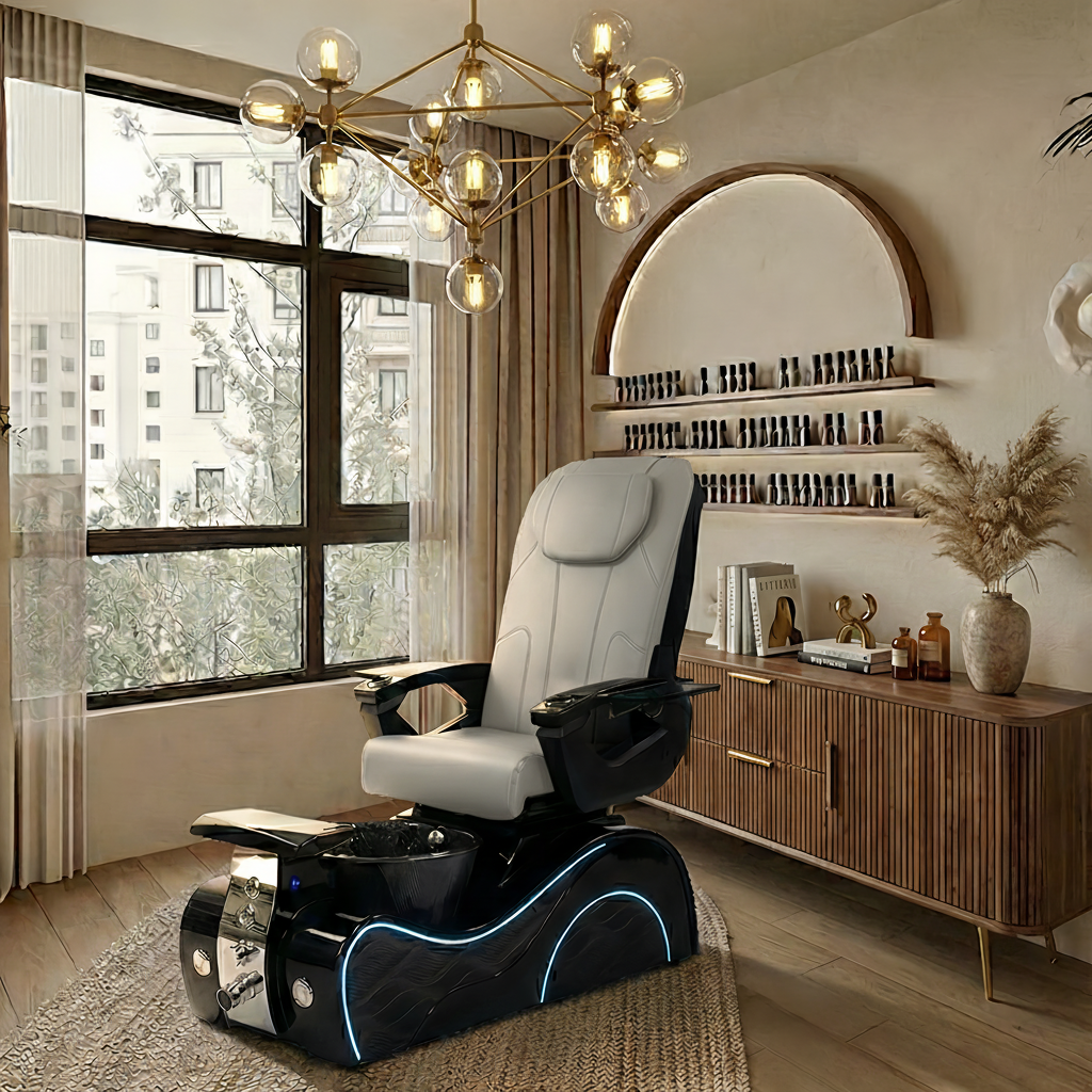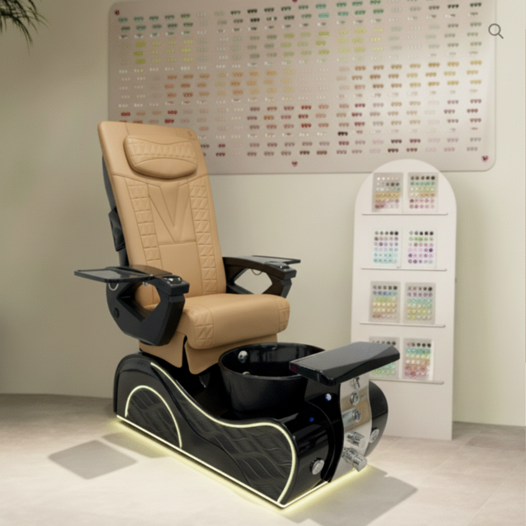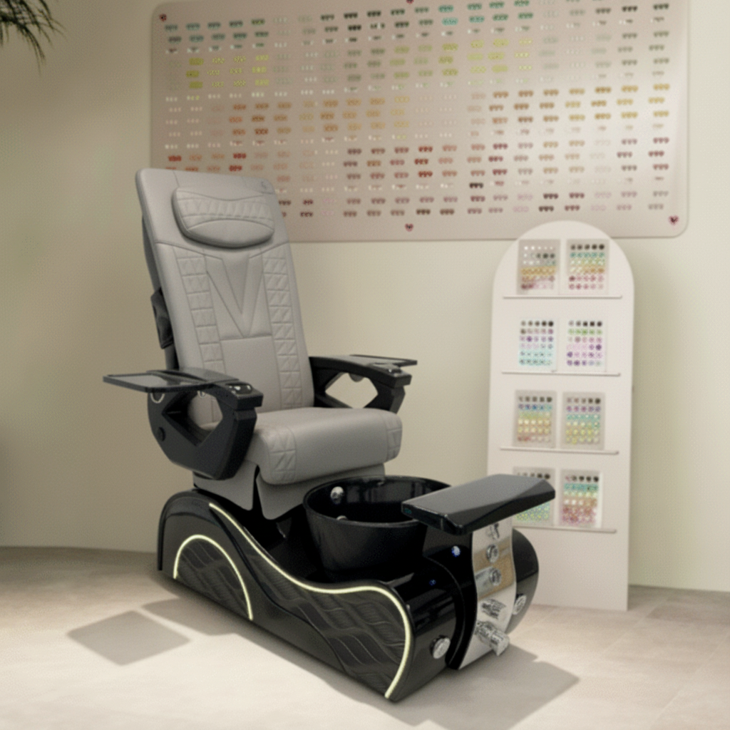 The reinforced spa base features bubble massage technology, odor-reducing ventilation, a UV/LED-friendly cushioned footrest, hot-and-cold plumbing, and a durable gel bowl illuminated by LED lighting. Engineered for high-traffic use, the chair is ETL & UL certified, meeting strict U.S. safety standards.
