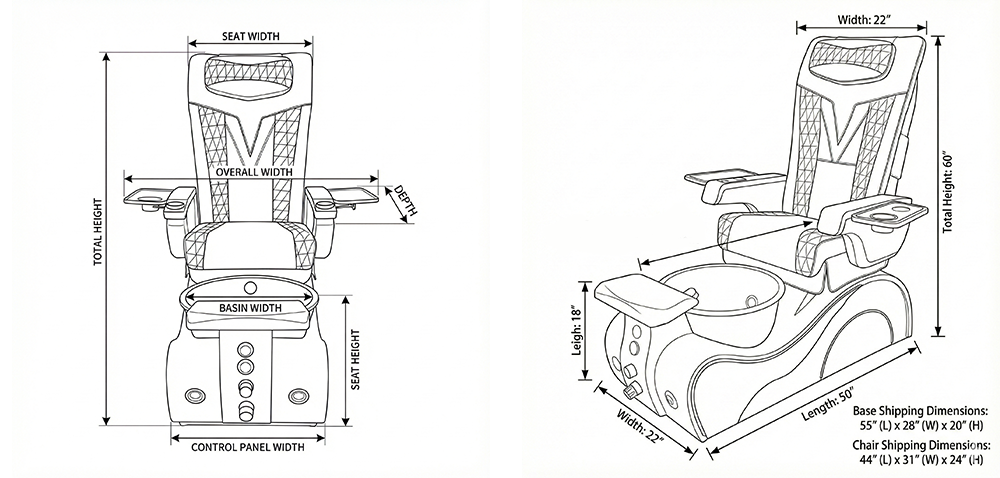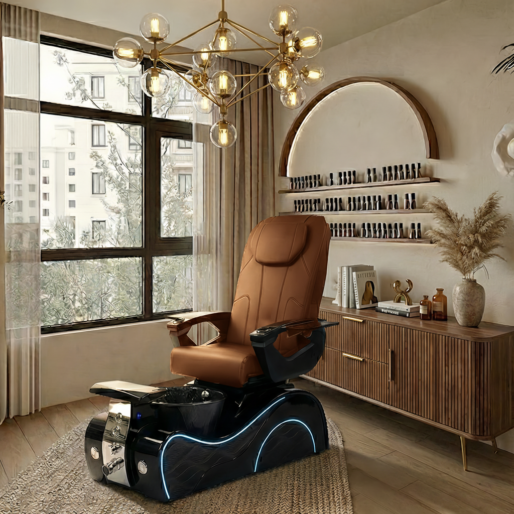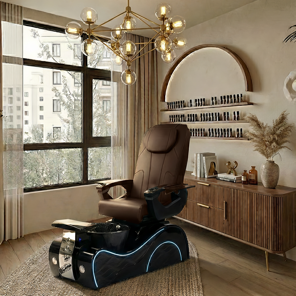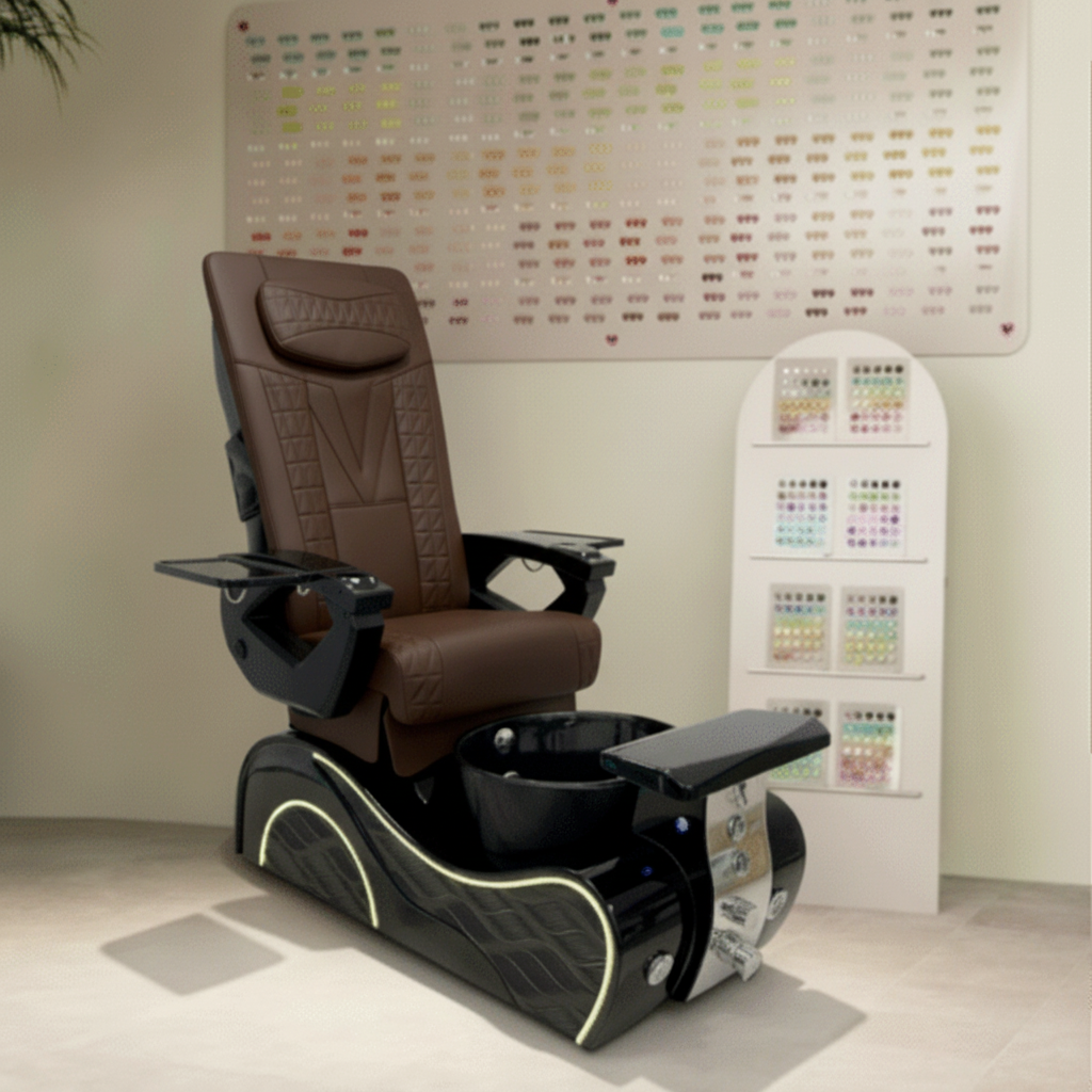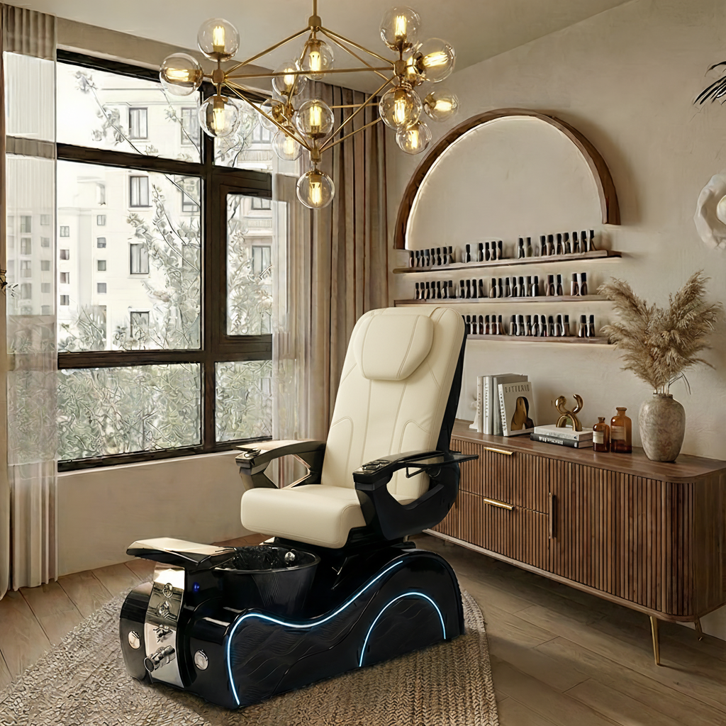 The reinforced spa base features bubble massage technology, odor-reducing ventilation, a UV/LED-friendly cushioned footrest, hot-and-cold plumbing, and a durable gel bowl illuminated by LED lighting. Engineered for high-traffic use, the chair is ETL & UL certified, meeting strict U.S. safety standards.