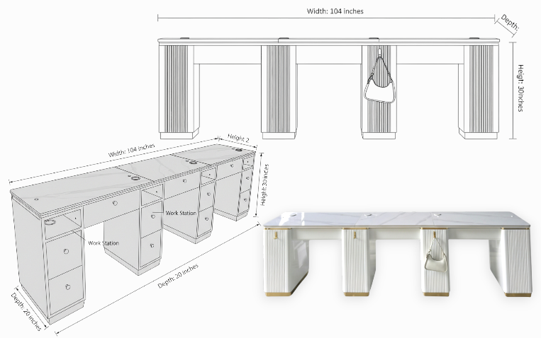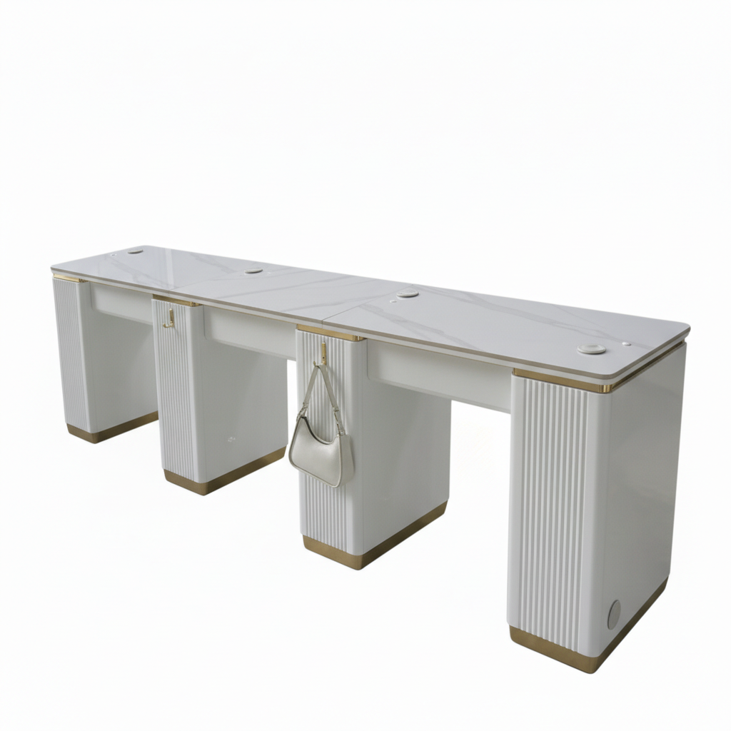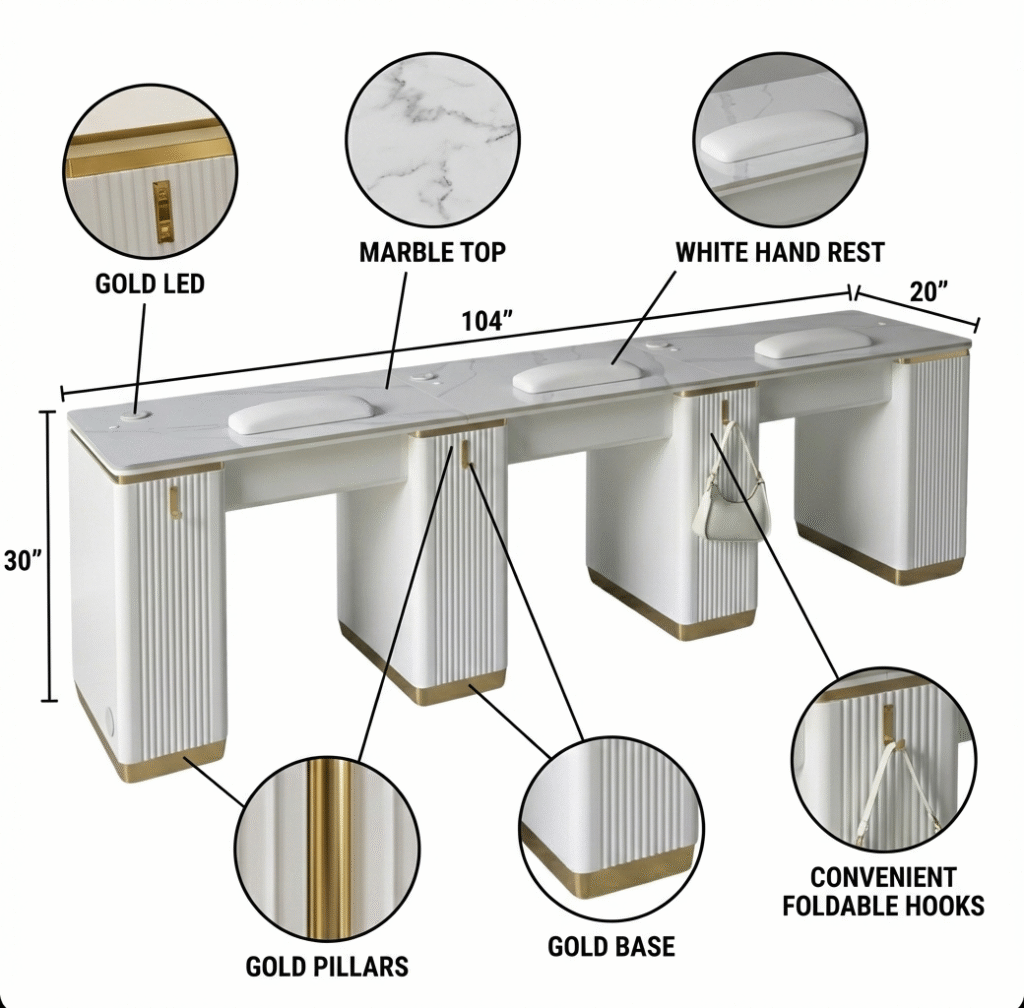 Triple White Gold Manicure Tables are built to support side-by-side manicure services in a clean, organized format. Whether serving pairs or managing higher client flow, these configurations help salons scale capacity while maintaining visual order.