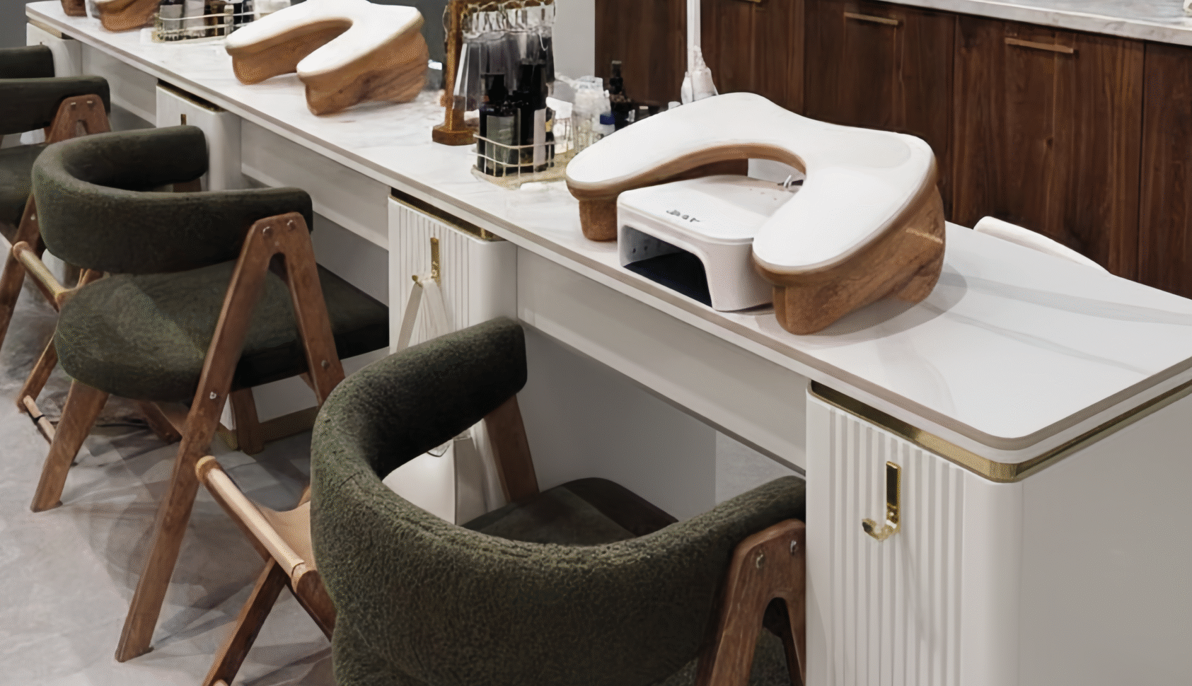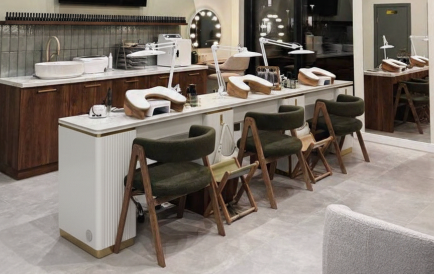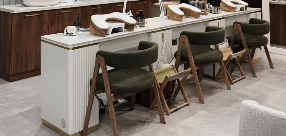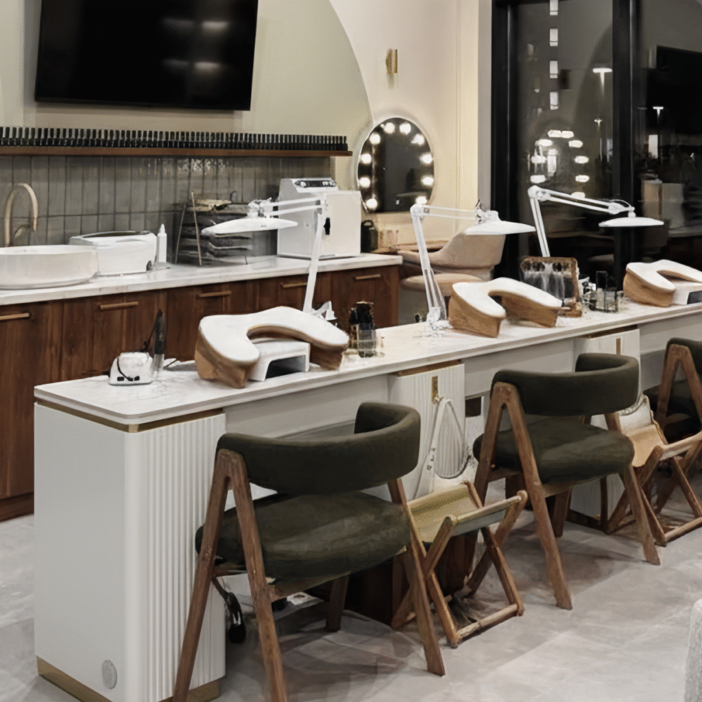 Each seat is proportioned for technician comfort and client ease, creating a consistent rhythm across the manicure area. The unified structure reduces clutter and keeps the floor plan visually balanced.